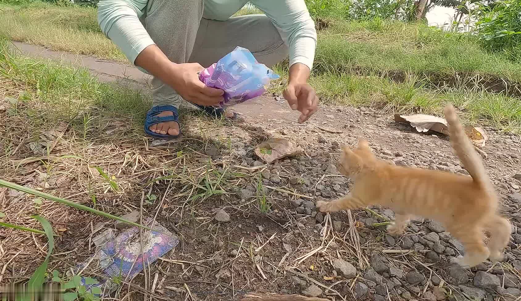 小哥第一时间从背包里拿出猫粮,小心地放在干净的塑料盖里。
